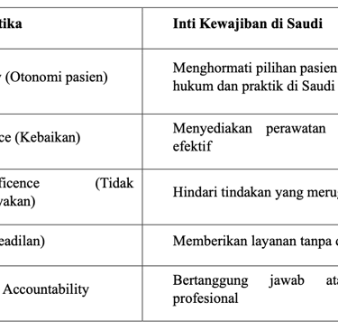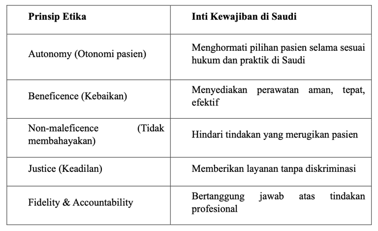 Kode etik kesehatan di Saudi Arabia bukan hanya dokumen profesional sekuler, tetapi berbasis pada nilai Islam, terutama konsep: